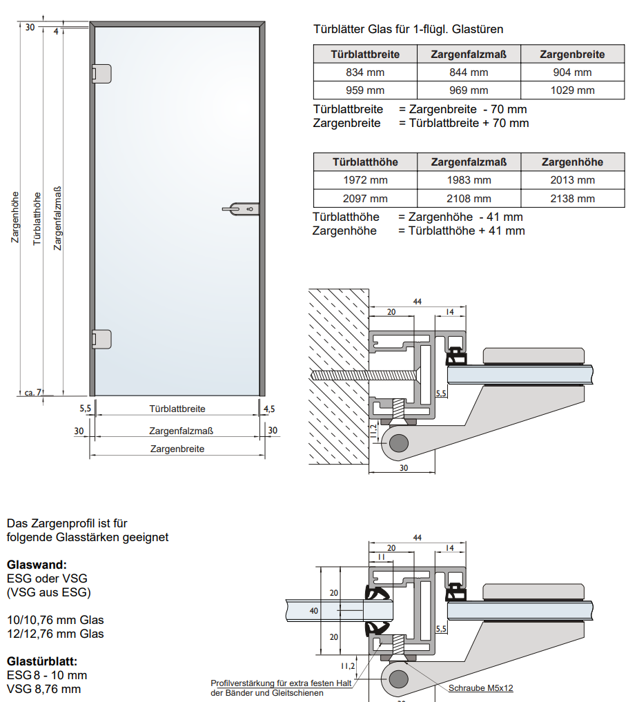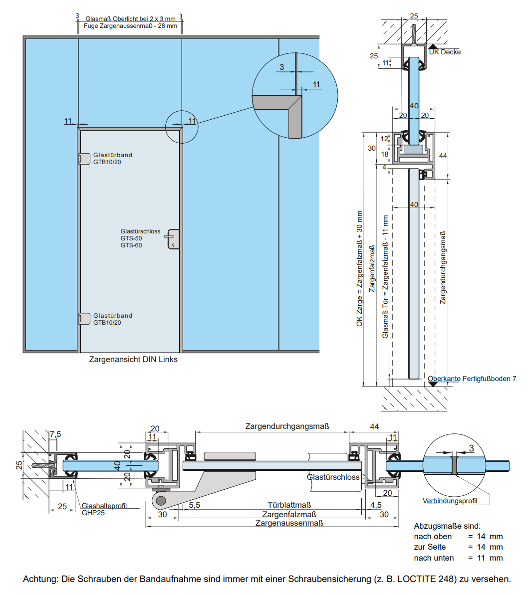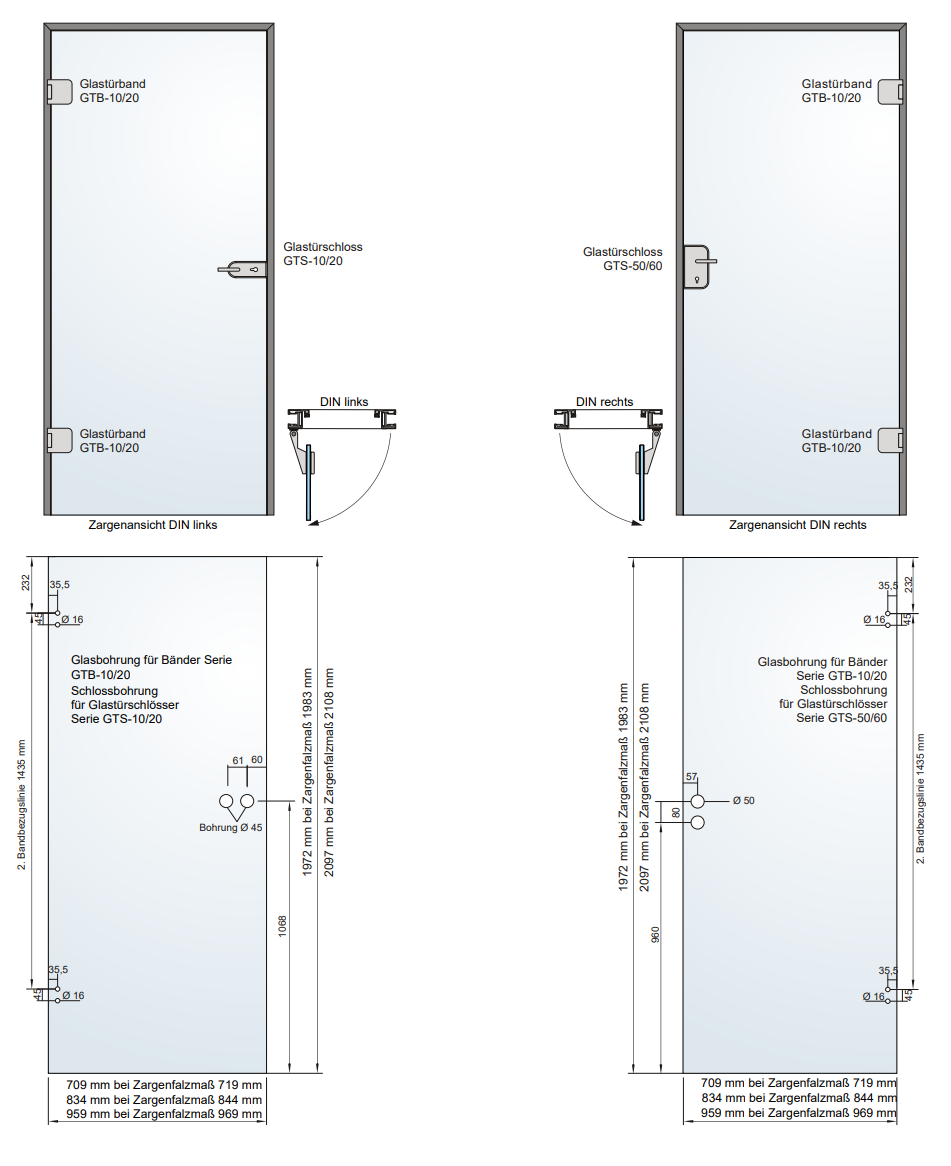 Ansicht Glastürzarge mit Glastüre DIN links und DIN rechts: