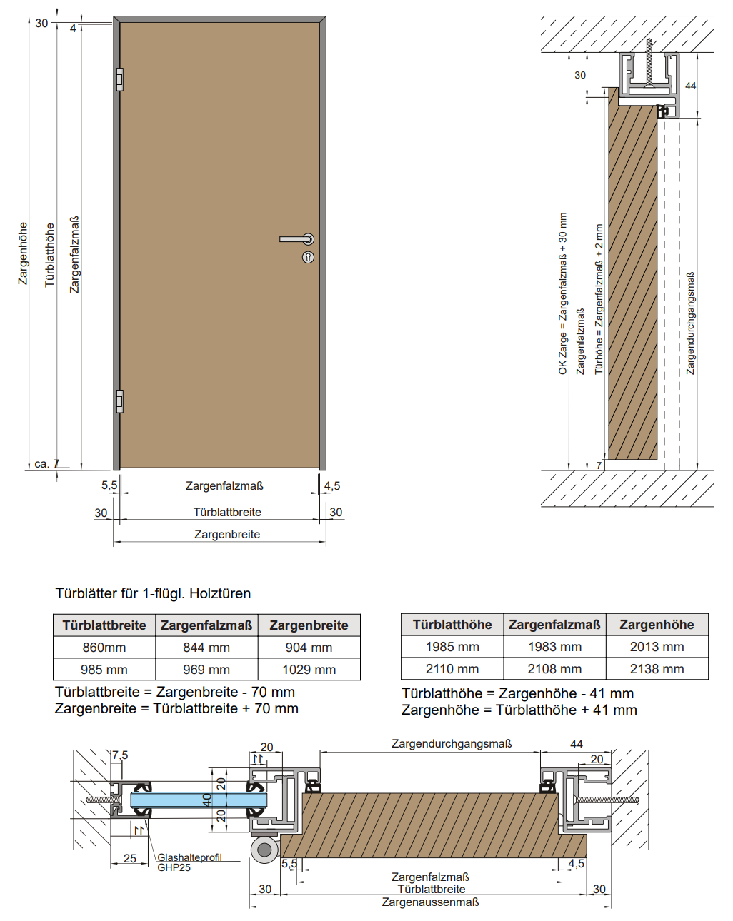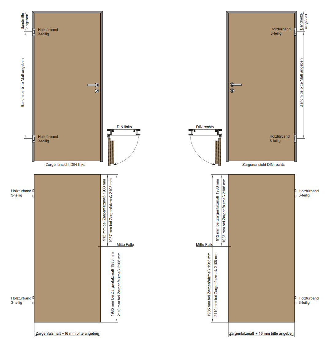 Ansicht Türzarge mit Holztüre DIN links und DIN rechts: