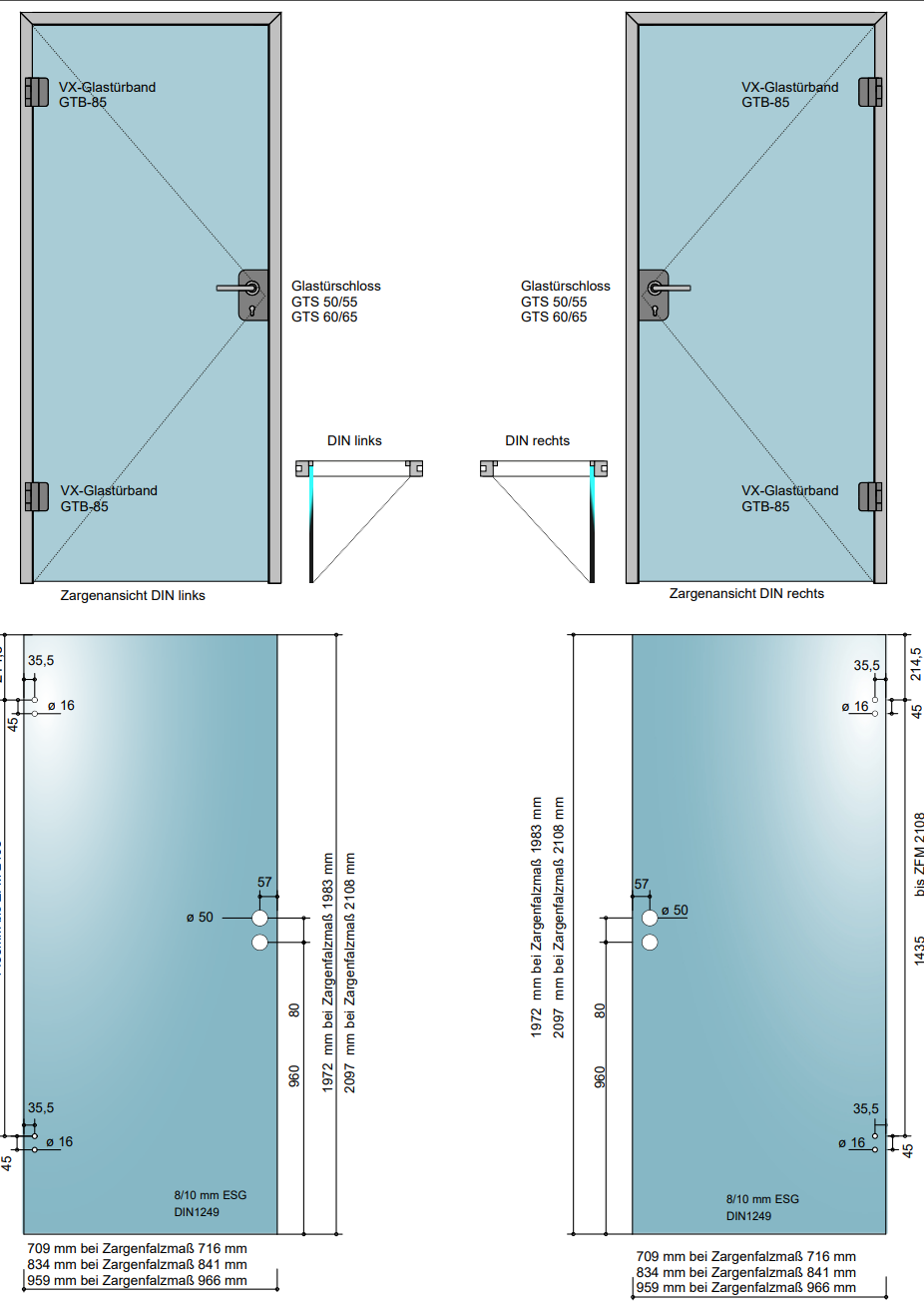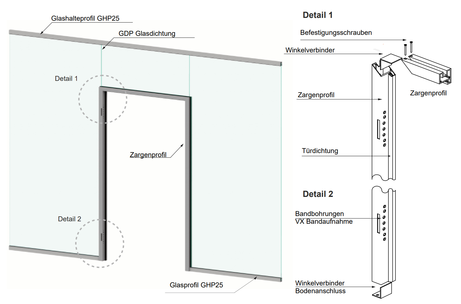 Ansicht Glastürzarge mit Glastüre DIN links und DIN rechts: