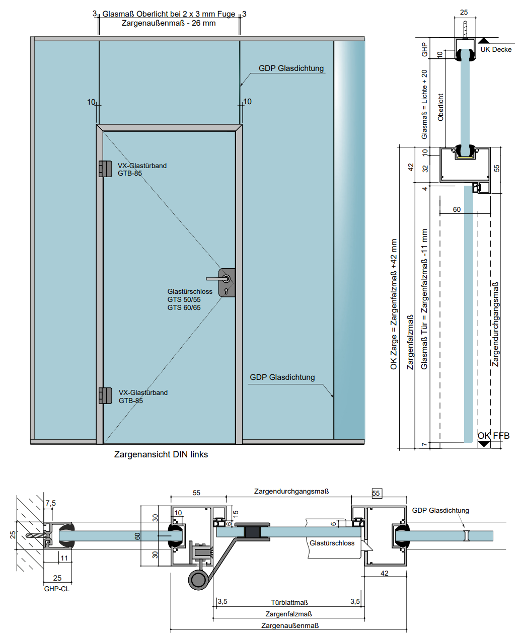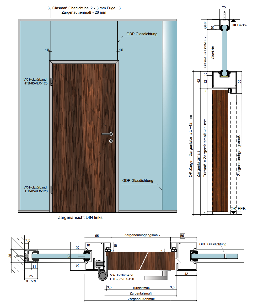Ansichten und Schnitte Glastürzarge mit Oberlicht:
