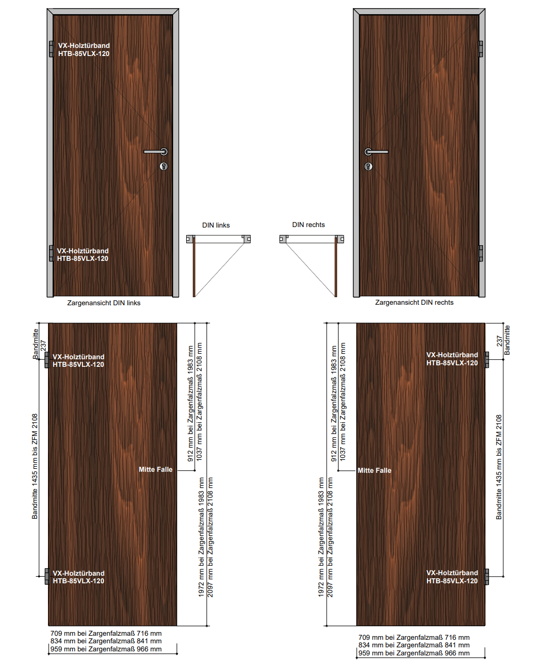 Ansicht Türzarge mit Holztüre DIN links und DIN rechts: