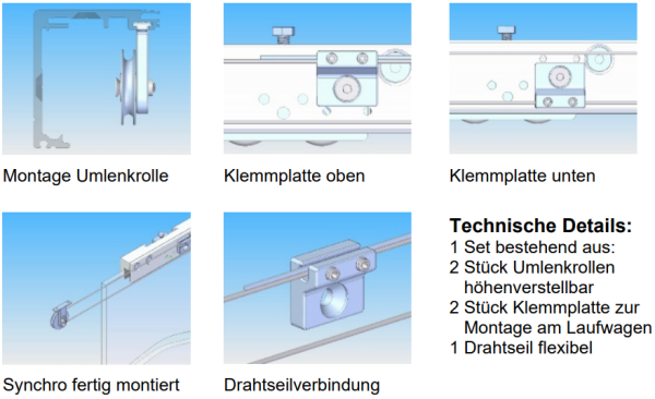 Die beiden Klemmplatten können auf dem Standardlaufwagen montiert werden. Das mitgelieferte Drahtseil wird dabei einmal unten und einmal oben in den Klemmbacken verklemmt und zuvor um die Umlenkrollen geführt.