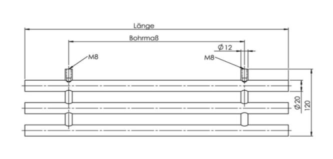 und zwei Querstangen (innenliegend) Ø 12mm mit M8-Innengewinde.