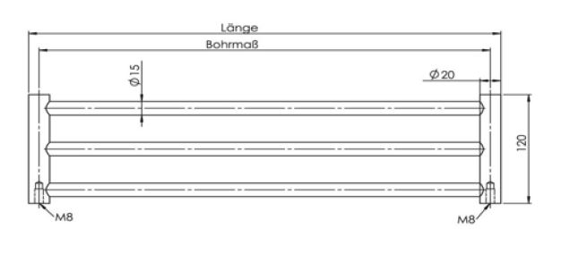 und zwei Querstangen (innenliegend) Ø 20mm mit M8-Innengewinde.