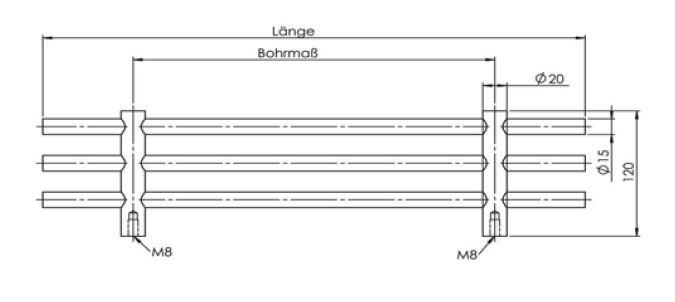 und zwei Querstangen (innenliegend-durchgehend) Ø 20mm mit M8-Innengewinde.